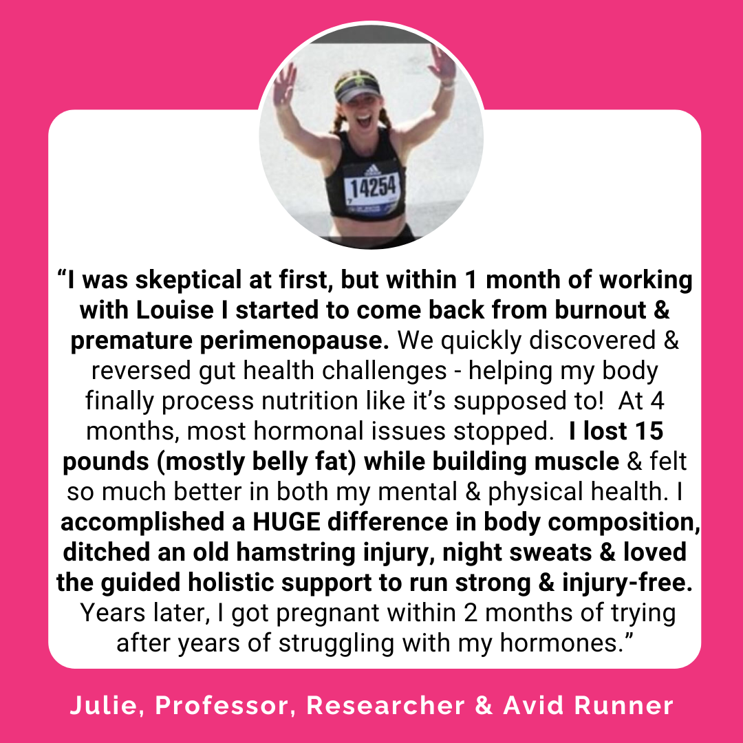 Like you, I wanted answers & to get to the root of WHY my body was stuck! I REFUSED to accept my health, hormone, energy, fitness, running & body composition decline as "normal" or "just aging."