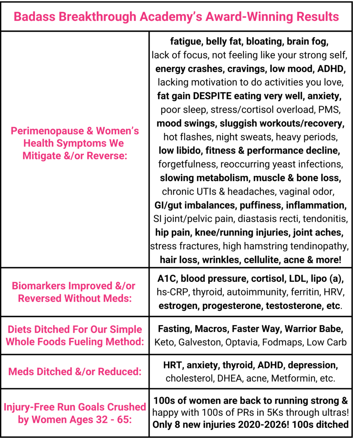 World-Leading* Holistic Results for Female Runners 35+ to Feel Our Best: Optimize vibrant health, hormones & body composition without meds, mitigate perimenopause symptoms, maximize a fit toned physique & run strong, energized & injury-free for life!