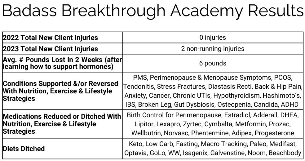 I didn't learn this in med school! Everything is so easy-to-follow. At an age where I'm supposed to be watching my body break down, I'm getting stronger, more fit & am more energized during long work days. I didn't think it was possible to PR my marathon in my 50s & not need Advil after, but I now know how to train & fuel WITH my female body! I recommend & refer out to Badass Academy for any active female who wants optimal health, longevity, fitness or to run strong for life!