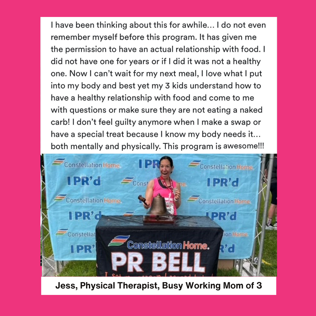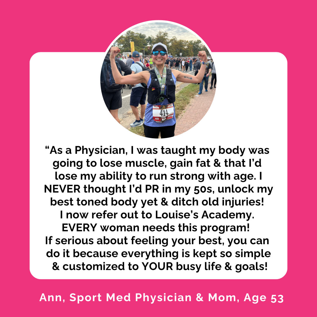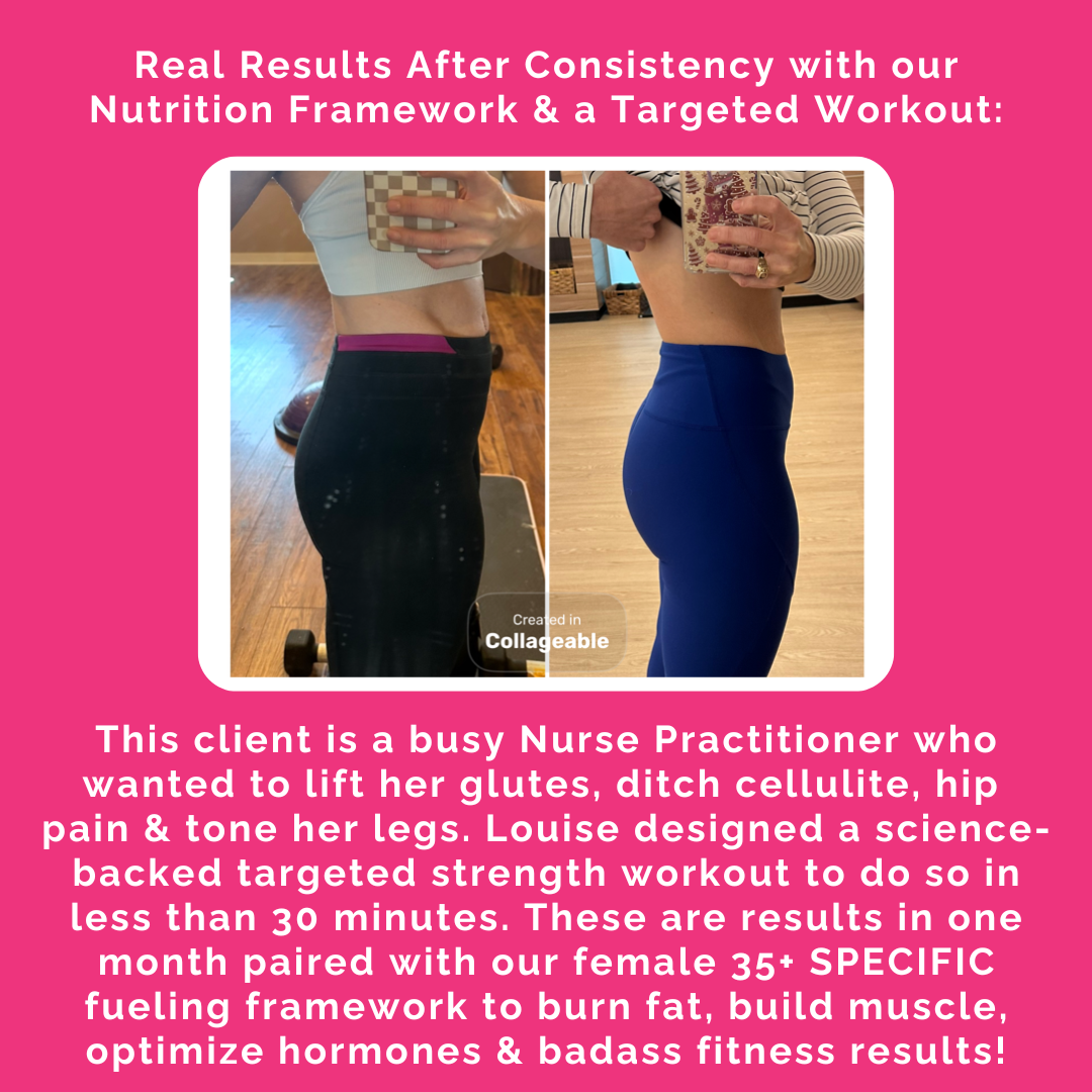 Despite working in the medical field for years & feeling like I knew a lot about my health, eating well, fat loss & strength training, I'm blown away by my experience! I went off HRT in 2 months & threw away most supplements. Acne my Dermatologist couldn't help is gone. I love that I know WHY I can't sleep, how to target specific areas of my body with strength training & have fat loss plans that are simple & modifiable without feeling restricted. I'm SO grateful to no longer be slowing down, feeling aches when I run, juggling diets or perimenopause "solutions." As my understanding of my body deepens & is kept simple to fit my life, I'm proud to have ease in feeling, looking & running my best!