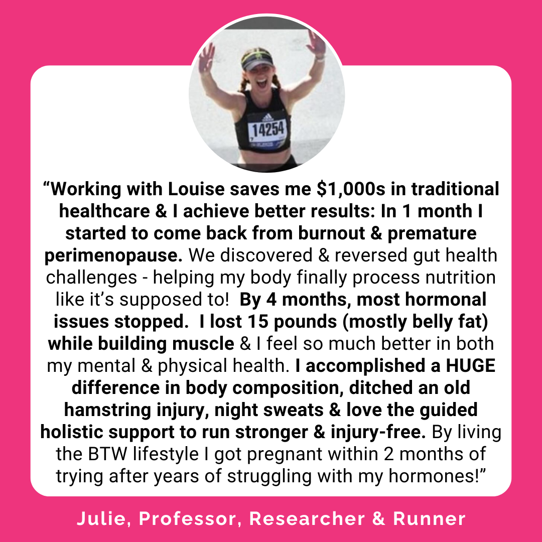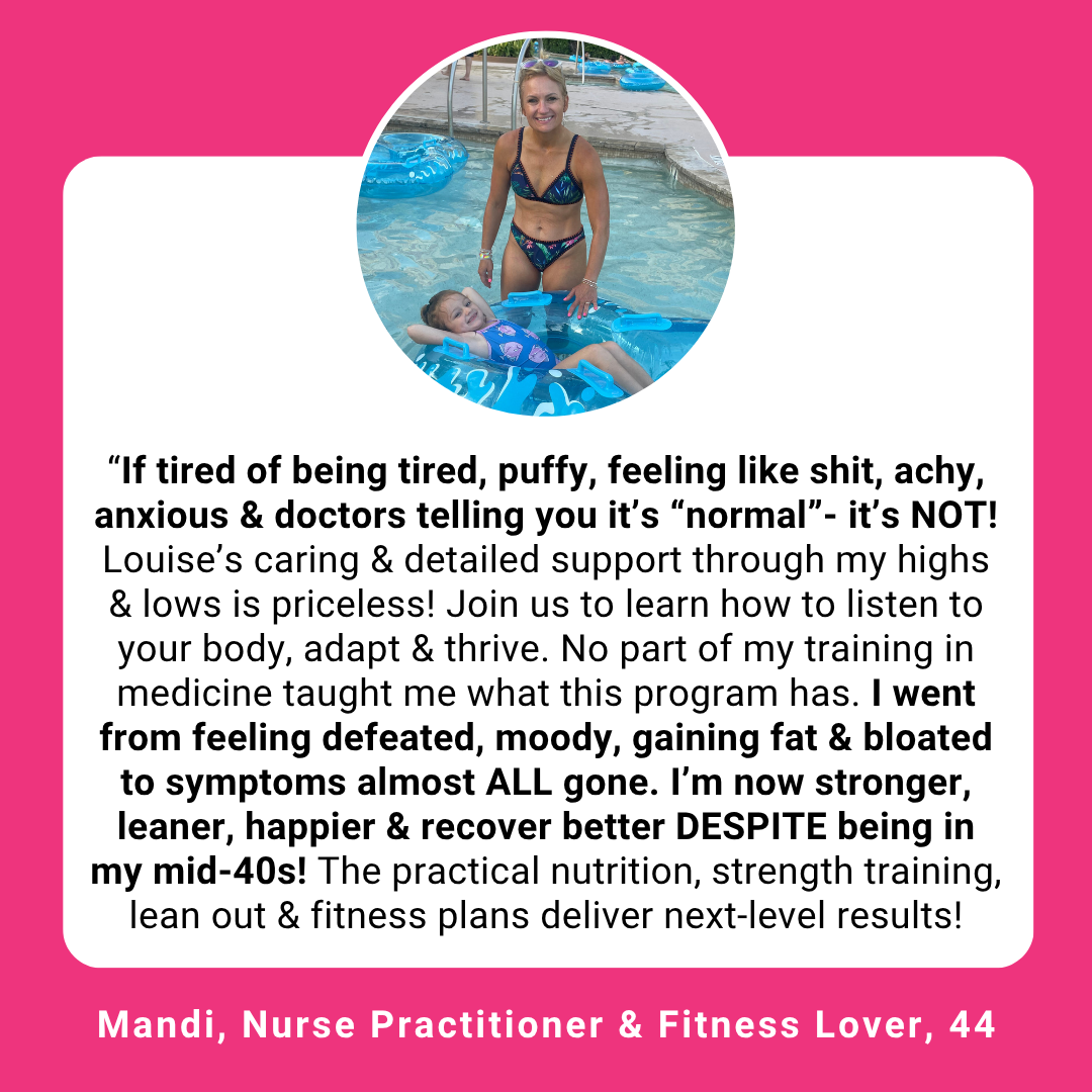 In my late 30s I was feeling fat & slow, like I was doing all the right things & it shouldn't be this hard! I lost 17 pounds, learned how to listen to my body & lean out without tedious tracking. Louise is a very response coach, creates resources as you need them & has amazing mindset, nutrition, fat loss & recovery hacks that fit my busy life!