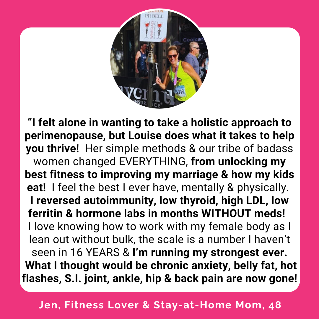 I was really discouraged, feeling like running was taking everything from me rather than fulfilling me. I have immense gratitude for the practical coaching, videos & handouts that explain everything. I no longer have headaches, struggle with psoriasis or lethargy! I understand why I bloat, why I get headaches & know how to keep inflammation low. I feel stronger every day & I actually look forward to running again! It took only weeks in this program to get rid of chronic pain & issues in my hip vs. years of PT that left me frustrated. Months later, I ran a 5K at a pace I hadn't seen in YEARS! When I joined I wanted to find my strength again & figure out how to handle this changing body. This program helped me do that & so much more. I feel like a whole new woman - thank you, thank you!