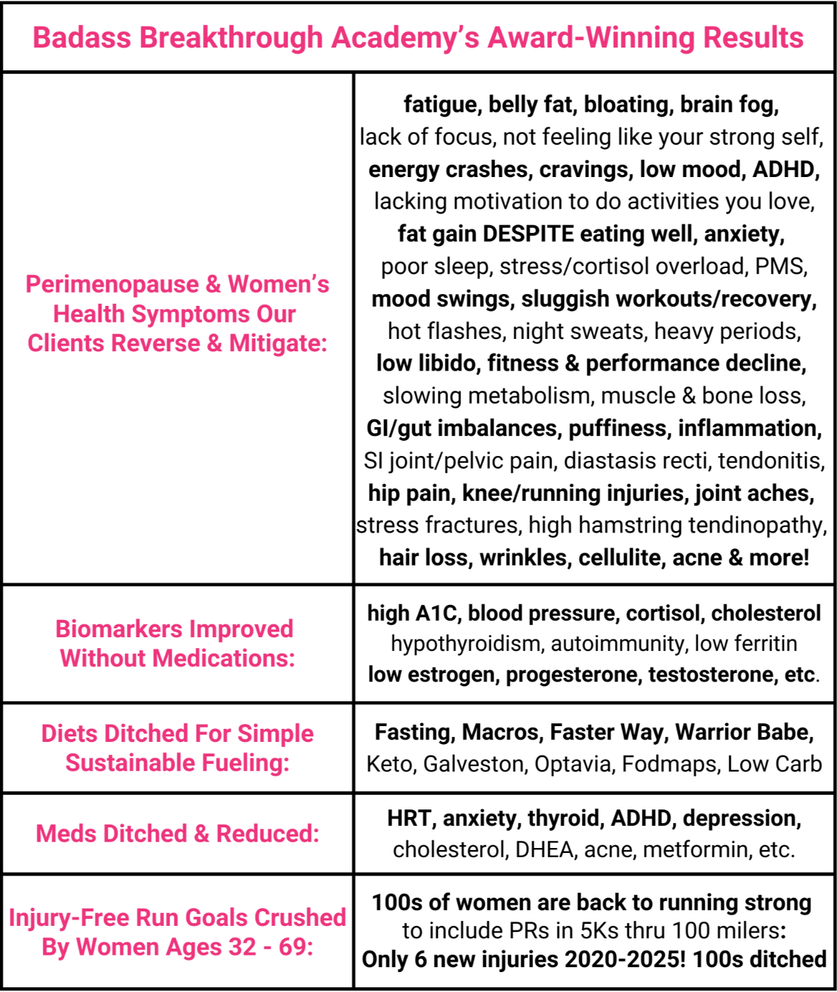 World-Leading* Holistic Results for Female Runners 35+ to Feel Our Best: Unlock vibrant health & hormones to mitigate perimenopause symptoms, build a badass body composition, maximize a fit toned physique & run strong, energized & injury-free!